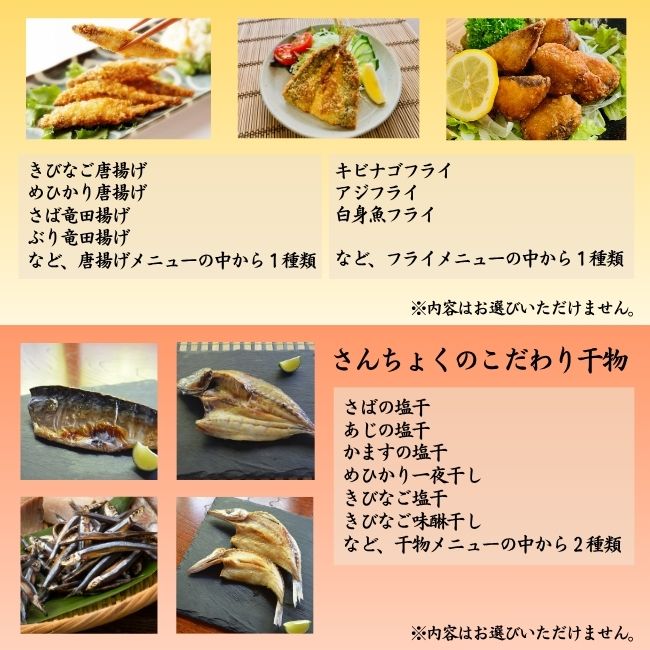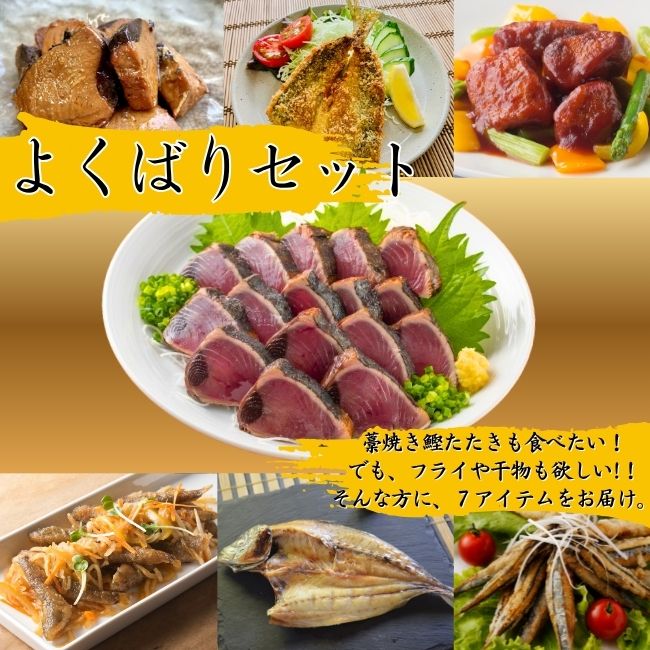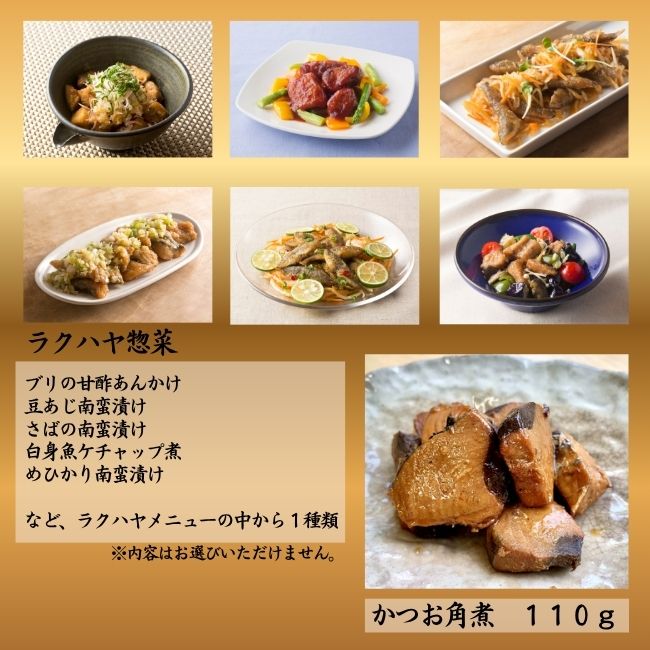 当店人気ナンバーワンの「鰹のたたき」はもちろん、干物・フライ・唐揚げがあり、さらに「カツオの角煮」とラクハヤのお惣菜もセットにしました。